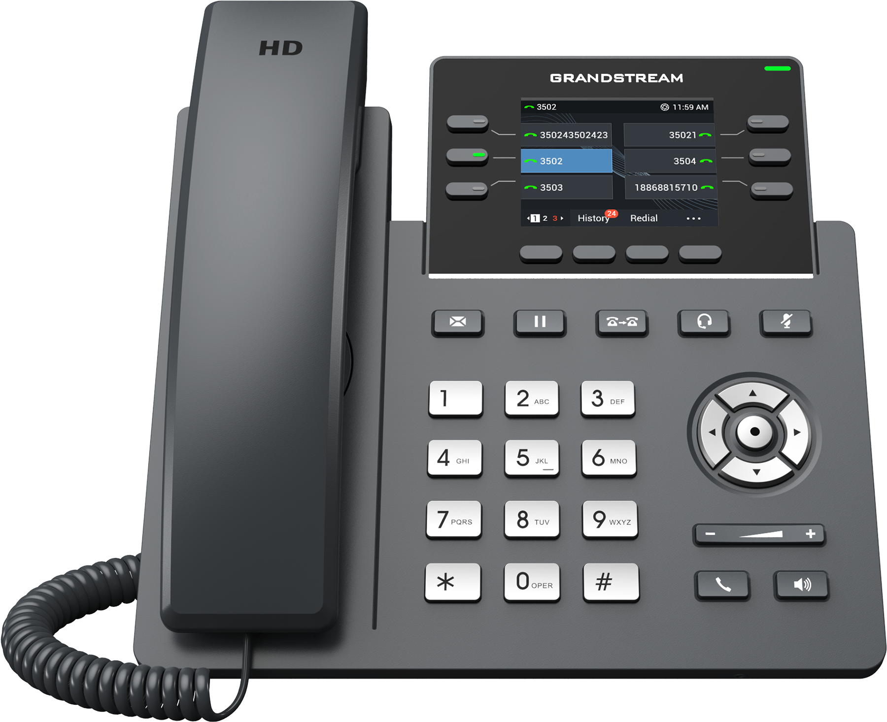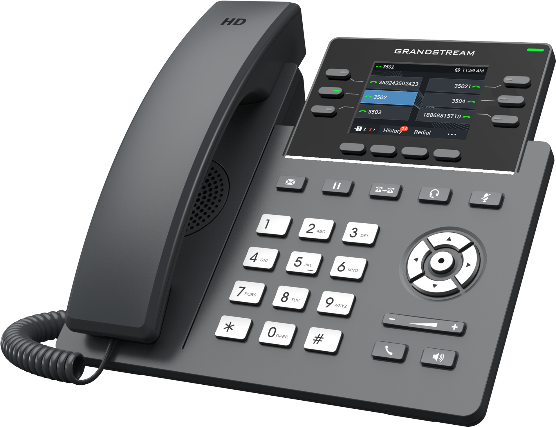 - 11 dedicated function keys including message, phonebook, transfer, conference, hold, headset, mute, redial, speaker and volume